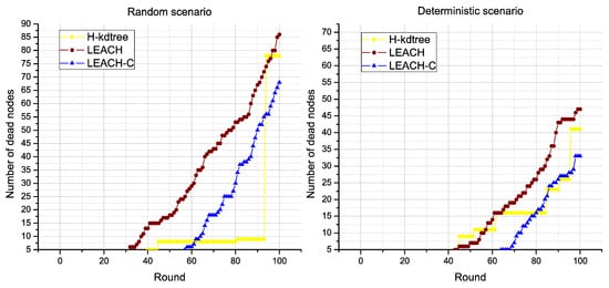 Regarding delay, the scenario with random node deployment shows more delay than the deterministic scenario with more density in its central area. H-kdtree maintains a stable number of CH nodes for the maximum possible number of rounds. This simplifies the work of the Sink/BS node, as each node has an identifiable death threshold that, when reached, triggers the transmission of a “Death” packet to the Sink/BS node to inform its death. This feature enables H-kdtree to maintain a network topology for the maximum possible number of rounds. This is not possible for LEACH and LEACH-C, per changes in the network topology in each round.