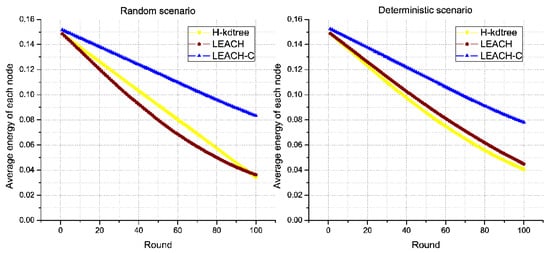 Figure 13. The reason is that the energy that LEACH and LEACH-C used in node formation is offset by the energy used in selecting CH nodes in H-kdtree, being that the latter is more stable in terms of variations and allows for a more stable behavior in the data transmission phase.