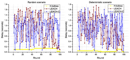 Table 6, H-kdtree is able to provide QoS in networks with hierarchical topologies. In both the random and deterministic scenarios, H-kdtree showed a reduction in delay of 87.72% in the random scenario and of 95.39% in the deterministic scenario, compared to LEACH. With respect to LEACH-C, H-kdtree presented a reduction of 82.095% for the random scenario and 93.1% for the deterministic scenario.