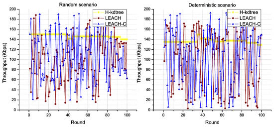 Regarding bandwidth and the amount of data that it can transport per round, H-kdtree showed an increase of 48.96% in the random scenario and of 39.37% in the deterministic scenario, which compensates and justifies the energy requirements for transmitting data packets to the Sink/BS node as shown in