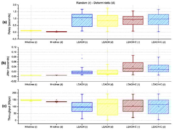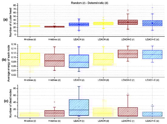 Figure 17 shows a general overview of the distribution symmetry of metrics, showing that (a) LEACH and LEACH-C shows a tendency to a symmetrical distribution of CH nodes in both the random and deterministic scenarios (This is due to the random function used in its algorithm). This result does not occur with H-kdtree. The four anomalous values shown in LEACH and LEACH-C are the minimum and maximum values in the observed rounds, outside the first and third quartile.