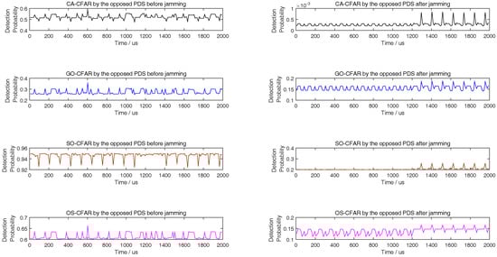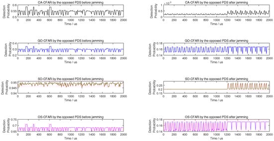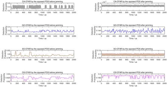 Detection probability of CA, GO, SO, and OS-CFAR before and after jamming when the number of reference units is 8.