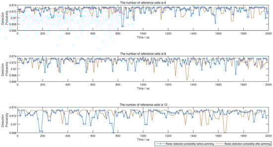 The left figures of Figure 3, Figure 4 and Figure 5 show the detection performance of different CFAR with different length of reference units, which illustrate that the detection performance of SO-CFAR is better when the length of reference units are 6 and 8. However, when the length of reference units is 12 the detection performance of OS-CFAR is better. According to (36), when  and without radar echo, the simulation results in the right figures of Figure 3, Figure 4 and Figure 5 show that the interference pulse has to fill in 4, 6 and 4 reference units of CFAR detector of the opposite PDS whose reference units length are supposed to be 6, 8 and 12 respectively.