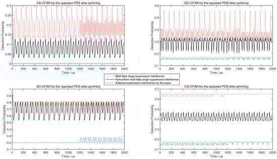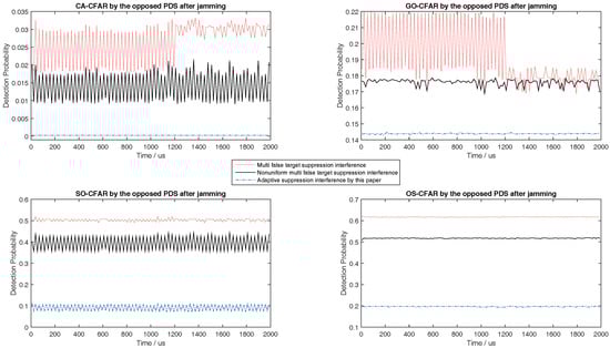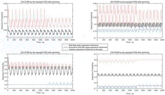 During the target tracking process, with the general interactive multiple models Kalman filter (IMMKF) and adaptive sampling by the airborne radar [], the state equations of maneuvering target in simulations is showed in Table 2, in which there are three models , , , and , , , . And the threshold of tracking accuracy is set to 160 m, and T is set to 0.1. Obviously, the target speed is higher; the sampling interval by airborne radar is smaller. Since the target tracking process is not the key point of this paper, the simulation here assumes that the target RCS is a constant and would not show the target tracking process. To illustrate the tactic of this paper, this paper at first simulates the detection performance of different CFAR when airborne jammer is invalid, and simulates the interference results when radar echo exists or not according to (36) in Figure 3, Figure 4 and Figure 5. Then, to show that the jammer echo does not interfere the tracking process, this paper compares the detection probabilities at each tracking time with and without interference process. Finally, through comparing the interference results with other two methods, this paper shows that the method proposed by this paper is effective.