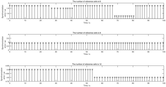 From (36), there is a necessary constraint  which is the key point to maintain the detection probability of airborne radar showed in Figure 6. In fact,  is influenced by the time synchronization performance. From Figure 3, Figure 4, Figure 5, Figure 6, Figure 7, Figure 8 and Figure 9, this paper assumes that the time synchronization performance of airborne radar and airborne jammer is perfect. However, the time synchronization error is always exists. The simulation in Figure 10 is to show the acceptable synchronization errors for different lengths of reference units. Figure 10 indicates that the shorter the reference units is, the smaller the acceptable synchronization error is. From Figure 10, we take the minimum value as the acceptable synchronization error of tracking while jamming system because the number of reference cells of the opposite PDS is difficult to know in advance, so that the acceptable synchronization error is 1.5 s which is showed in the top subgraph. Although the simulated acceptable synchronization error in the middle subgraph is a constant, this is only a coincidence which might be from the assumed simulation parameters above and the minimum step of synchronization error which is 0.1 s in simulation.