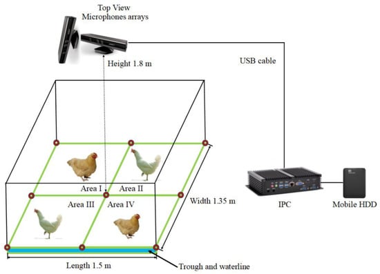 Information about animals can be transferred over long distances by sound. The acoustic monitoring of farm animals is non-invasive and may be used as an efficient management tool to improve animal health, welfare and the economic efficiency of farms [1,2,3,4]. In recent years, interest in the analysis of farm animal vocalisation has grown, and various attempts have been made to decode the relationship between animal sound and animal behaviour [1]. For instance, some approaches have examined the relationship between vocalisation and the health of pigs and dairy calves [2,3,5,6,7,8]. Others suggest that vocalisations could serve as indicators of poultry welfare [9,10,11]. Sound analysis systems can be used to predict feed intake by monitoring pecking sounds [12,13,14]. Sound source localisation systems can be used to detect pig respiratory disease [15]. Some researchers have focused on vocalisation analysis of small-scale poultry breeding groups to model intensive cultivation [16,17]. However, unlike monitoring large farm animals, real-time sound analysis or sound recognition in a large-scale henhouse remain a great challenge since many sounds are produced at the same time. The basis of the sound analysis method is the identification of particular poultry sounds. Rather than simply monitor the whole house, this study focused on real-time poultry sound source localisation for precision research and quantitative analysis. Certainly, automatically captured abnormal sounds, such as respiratory disease symptoms (grunts, snores, and coughs) or noises from machine malfunctions at night, can help find sick chickens and solve problems quickly.