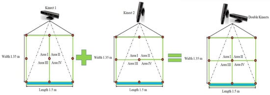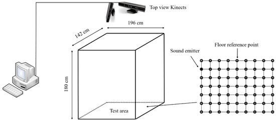 Two top-view Kinect cameras for Windows V1 (Microsoft Corp., Washington, WA, USA) were installed perpendicular to each other 1.8 m above the centre of the floor. Each Kinect was equipped with an RGB camera, a depth camera and a microphone array consisting of four different microphones placed in a linear order (three are placed on the right side and the other one is placed on the left side), sharing a common horizontal axis. From the left to the right, the distances between the microphones were 149 mm, 40 mm and 37 mm [23]. The microphone array could supply four channels of 32-bit audio at a 16 kHz sampling rate. Kinects continuously collected both digital images in JPEG format (640 × 480 pixel resolution, recorded at approximately 1 s intervals, used for manual verification) and multi-channel signal input (4-channel, 32-bit, 16,000 Hz, used for automatic sound source localisation measurements at 1 s intervals). Figure 1 shows that the microphone arrays were connected via two USB ports to one mini-industrial personal computer (IPC, Shenzhen Konghui Intellitech Co., Ltd., Shenzhen, China) for achieving coherence of the time series. It was also equipped with a 2 TB USB 3.0 mobile hard disk drive (HDD, Western Digital Corporation, LakeForest, IL, USA) to record data.