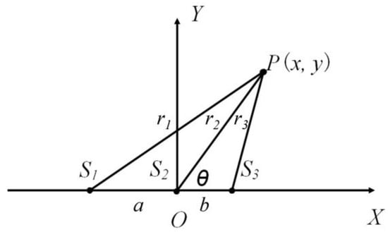 In Figure 3, it is supposed that the sound source and any three microphones are at point P (x, y), S1 (−a, 0), S2 (0, 0) and S3 (b, 0), respectively. Point P (x, y) can be represented by the angle (the included angle between line S2S3 and line PS2, “°”) and the distance between P and S2 (line segment PO, ), which can be calculated through a geometrical relationship: