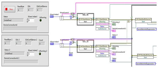 Based on the SSL method, one Kinect linear direction estimation with three microphones can determine right ( > 0°) or left ( < 0°) and two Kinect estimations with six microphones can synchronously localise four quadrants (Figure 4). Only Kinect direction estimations were chosen for SSL tests because its distance estimations were unsatisfactory due to their large error. Kinect microphones sensitivity and their 16 kHz sampling are important factors that can lead to delay estimation errors [28]. Time series of two Kinect sensors were consistent because of their connection to the same computer with the same measuring time. The SSL method was embedded in this online monitoring system by calling Kinects SDK in one whole loop to realise the real-time localisation function. The SSL measurements of two Kinects were LabVIEW controlled to start KinectSensor and KinectAudioSource together to invoke nodes (Kinect SDK) for synchronous acquisition at 1 s intervals (Figure 5).