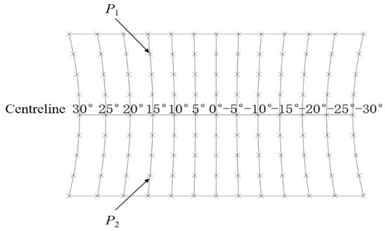 Reference values of sound source angle for a single Kinect positioned on the centreline at 0°. P1, a random sound source point; P2, a symmetry point along the centreline that has the same and .