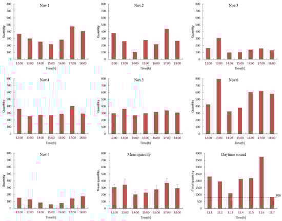 In the application of the SSL method to small poultry group tests, the number of hourly vocalisations (from noon to 6:00 p.m.) of the flock in the horizontal plane and the overall mean (mean ± SE) are presented in Figure 7 (data from 1–7 November were selected). The SSL method can count whether there was sound production and valid SSLs at 1 s intervals through data pre-processing of Section 2.4 or not. The number counted in an hour was the number of hourly vocalisations. It can be observed that the number of vocalisations during feeding time was higher than at any other time. The flock produced more vocalisations during feeding time, which derived from their demand or calling for food. The quantity of sounds was above 600 times (40 times per chicken) during feeding time on an average day. There is so much difference in amount of vocalisations between the days because different feeding time (normal or abnormal) as well as external stimulus might cause different vocalisation in laying hens. For example, more sounds arose on 6 November. This was the result of an egg collection causing disruption to normal feeding (1:00 p.m.) and the ensuing stress response from the flock. Lack of food resulted in more sounds arising between 4:00 p.m. and 6:00 p.m. on 6 November. The number of hourly vocalisations and area distributions (from 11:00 p.m. to 3:00 a.m.) of the flock are presented in Figure 8. The SSL method can not only count whether there was sound production and valid SSLs, but also locate to the exact sound source areas for quantitative sub area counting statistics. A high number of vocalisations arose in the daytime (noon to 6:00 p.m.), (more than 800 times or 53 times per chicken), and a minority arose during the night (11:00 p.m. to 3:00 a.m.), that is, normally fewer than 15 times (1 time per chicken) (Figure 7 and Figure 8). From noon to 6:00 p.m., laying hens might rest, socialise, eat, drink, and express their natural behaviour and the higher number of vocalisations tend to occur erratically during this period [31]. Generally, the number of vocalisations during the daytime was more random than that during the night.