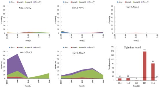 Figure 8 shows the area distributions of poultry vocalisations at night (from 11:00 p.m. to 3:00 a.m.). In normal conditions, vocalisations produced by hy-line browns can hardly be heard at night, yet abnormal environmental conditions or failing management practices can cause stress to the flock, resulting in the production of more abnormal sounds. Due to late and inadequate feeding, animals were in starvation status on the nights of 5 and 6 November, which lead to increased vocalisation distributions in the feeding and drinking areas (the 4th sub chart in Figure 8). By analysing the number of poultry vocalisations and their area distributions via SSL methods, we can identify abnormal sounds (e.g., if the number of the flock’s vocalisations are obviously higher than its normal quantity at night) to find feeding problems.