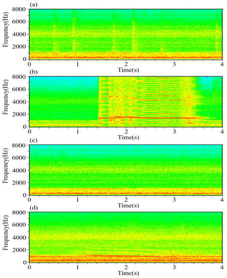 Spectrograms depicting (a) pecking sound for water, (b) cock crow sound, (c) mechanical sound and (d) chicken grunt sound.