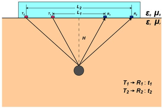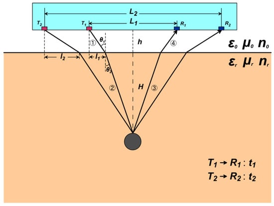 Figure 1 illustrates the geometric propagation paths of electromagnetic waves when the two sets of radar transmitters () and receivers () with different offsets () are close to the ground. The dielectric constant of the medium is estimated by the different arrival time (&) of the reflected waves from a same anomalous body.