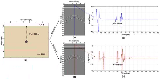 The first case (transmitter and receiver are close to the ground): (a) The model; (b) The forward result with an offset of 1 m; (c) Forward result with an offset of 2 m; (d,e) The single traces, as shown in the figure.