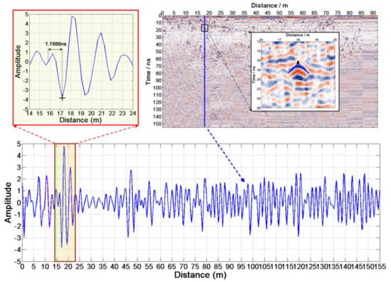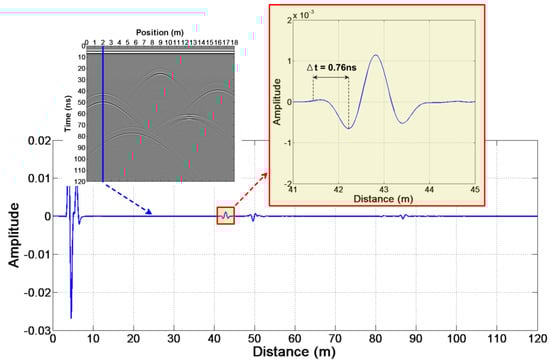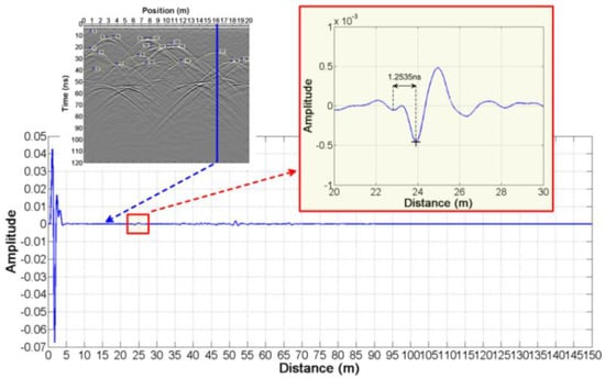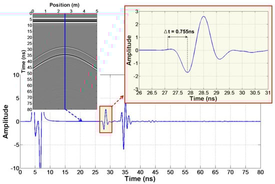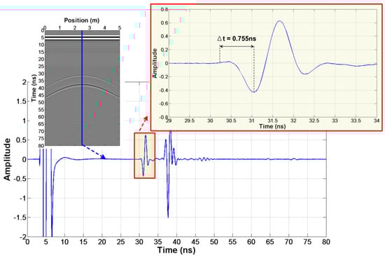 Step 2.2. Then, extract a reflected wavelet from the radar profile and read the time from the jump point to the first significant extreme point in the wavelet.