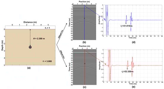 The second case (transmitter and receiver is of 0.5 m high from the ground): (a) The model; (b) The forward result with an offset of 1 m; (c) The forward result with an offset of 2 m and (d–e) The single traces as shown in the figure.