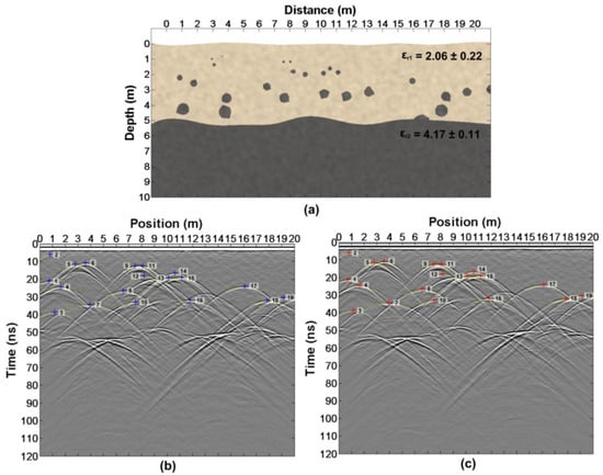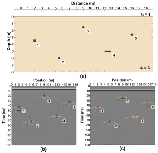 Firstly, the simulation of the forward modeling (Figure 3a) have been done. FDTD (Finite-Difference Time-Domain) is applied for the simulation of the simple model. The FDTD main code was written by Irving and Knight [] but we modified some parts of the code (the import of the model, the export of the wavefield snapshot and so on). Some key simulation parameters are presented in Table 1 and we obtain two sets of radar profiles with different offsets (Figure 3b,c).