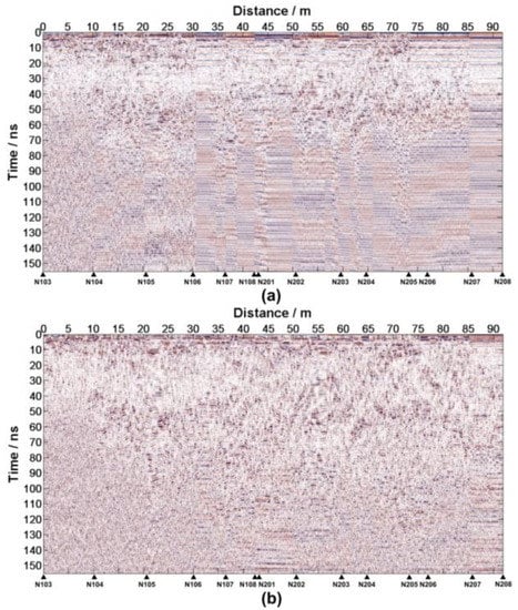 Consistent with the second case, the model (Figure 5a) is simulated firstly and the parameters are shown in Table 1. Two sets of radar profiles with different offsets are obtained (Figure 5b,c). What is different from the first case is that the radar transmitter and receiver is of 0.5 m above the ground.