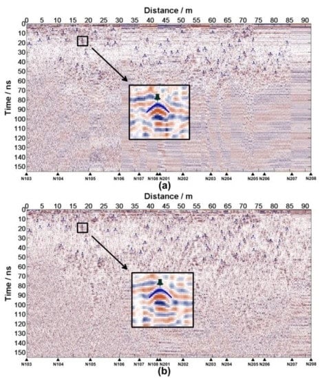 - Marpaung, D.H.; Lu, Y. A Comparative Study of Migration Algorithms for UWB GPR Images in SISO-SAR and MIMO-Array Configurations. In Proceedings of the 15th IEEE International Radar Symposium (IRS), Gdansk, Poland, 16–18 June 2014. [Google Scholar]