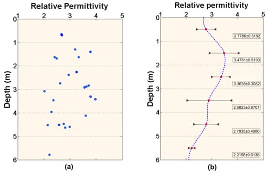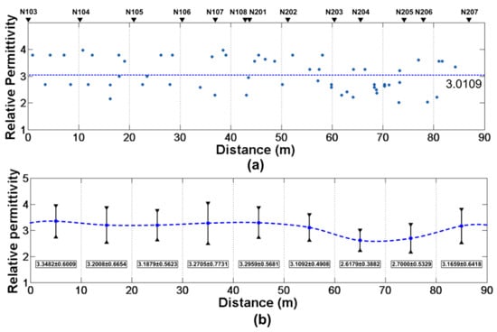 After a comprehensive consideration, we set a weight based on the reciprocal of the estimated height of each anomalous body as the final result. Since if the standard deviation of the recovered permittivity values is quite large, calculating the mean of the recovered permittivity values is too simple and is not a reliable methodology. However, if the radar data has a low signal-to-noise ratio and a high energy attenuation, it is too difficult to obtain the real amplitude of the reflection waves. If the reference target is particularly deep, the estimation could become sensibly inaccurate, so setting a weight based on the reciprocal of the estimated height of each anomalous body as the final result could be an easy and reliable method.