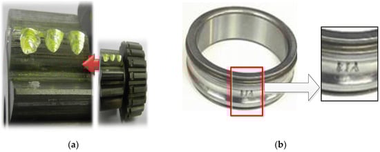 The vibration signal was recorded based on the planetary gearbox test rig shown in Figure 2. The rated torque of the test planetary gearbox was , and the maximum input speed was 2800 with a resulting output speed of 388 . The accelerometer with a sensitivity of 28.7 was mounted on the outer housing of the ring gear along the position of the test planetary gear bearing. The collected data were sampled at 96 kHz with a resolution of 24 bits in the measurement system as shown in Figure 3. The fault modes include sun gear chipped and planetary gear bearing with inner-race fault, as illustrated in Figure 4a,b, respectively. The structural and kinematical parameters of the test planetary gearbox and planetary gear bearing are listed in Table 1 and Table 2.