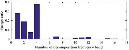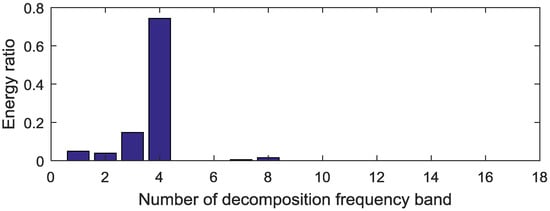 Figure 9a,b shows the waveform and spectrum of the measured vibration signal under the condition of planetary gear bearing with inner-race fault. It is difficult to identify the fault characteristic frequencies from the spectrum in Figure 9b. On the basis of the proposed method, the WPT is applied to decompose the vibration signal into a group of WP nodes with a complete binary tree form. Then the WPE matrix is calculated. The energy distribution proportional histogram of the vibration signal of the bearing inner-race fault is shown in Figure 10.