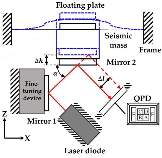 Figure 2 shows the optical path of the sensor system. The laser beam from the laser diode with an incident angle is reflected by the mirrors and then projected onto the QPD. A vertical displacement ∆h of Mirror 2 causes a lateral shift ∆l of the light spot on the QPD. The relationship between ∆h and ∆l is expressed by: