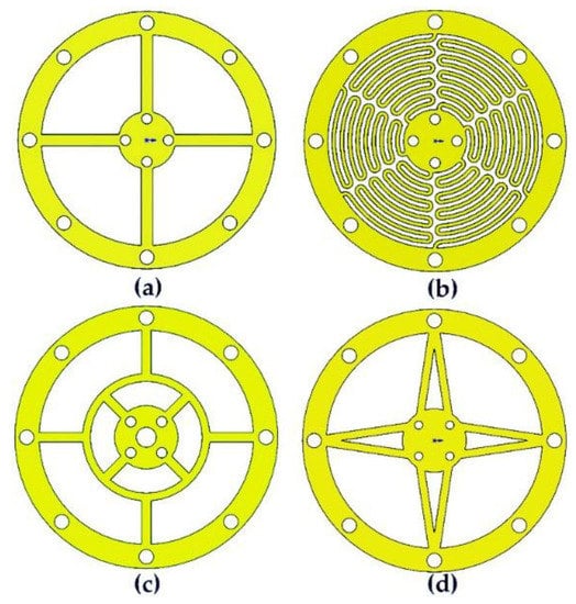 Leaf spring shapes. (a) cross; (b) serpentine; (c) double circular; (d) V shape.