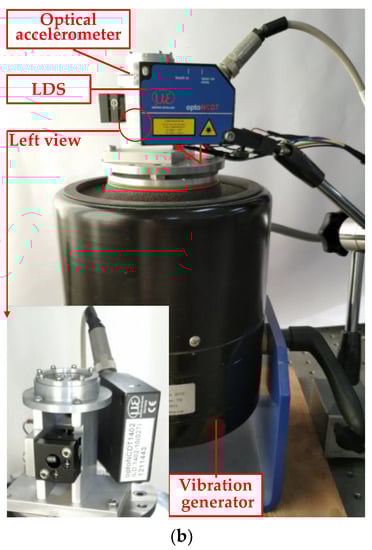 Experimental setup for the designed optical accelerometer calibration. (a) Diagram, (b) photo. LDS: laser displacement sensor.