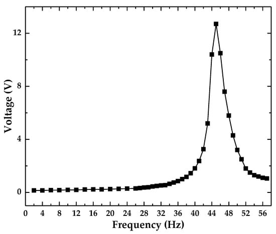The resonance frequency of the optical accelerometer was obtained using the experimental set-up shown in Figure 6. The wave generator was used to output a swept sine waveform signal, which was input to the power amplifier, amplified, and then supplied to the vibration generator. The outputting voltage from the optical accelerometer was recorded in the range of 2–26 Hz with an interval of 2 Hz, and in the range of 26–57 Hz with an interval of 1 Hz. The results are presented in Figure 7.