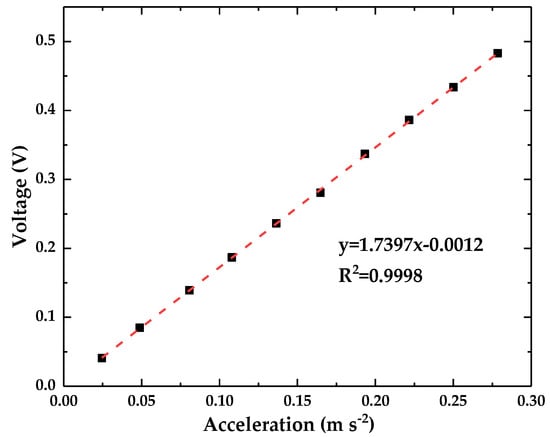 where s is the sensitivity of the accelerometer and Vmax is the maximum voltage that the accelerometer can output. The maximum voltage that the accelerometer can output is 12.7 V, and its sensitivity is 1.74 V (m·s−2)−1. Therefore, the maximum acceleration that the accelerometer can measure is 7.29 m·s−2, and the measurement range of the accelerometer is 0.003–7.29 m·s−2.