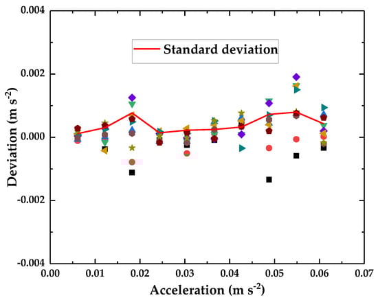 To test the stability of the accelerometer’s output, repetitive tests were performed. A homemade high-performance vibration generator [31] is used to provide an acceleration excitation signal. The vibration generator can achieve steady output displacement with frequency range of 0.6–50 Hz, an analytical displacement resolution of 3.1 nm and an acceleration range of 0–1.93 m·s−2. In order to monitor the displacement of the homemade vibrator, an eddy current sensor [32,33] is used as a reference sensor, the output sensitivity of the sensor is 0.2312 V·μm−1, the measurement range is 50 μm, the resolution is 0.72 nm, and the maximum nonlinearity error is less than 1%. We used a sine waveform with a constant frequency of 8 Hz as the excitation signal and varied the input amplitude of the vibration generator within the range of 12–120 Vpp (corresponding amplitude ranging of 2.2–19.7 μm). The reference sensor and optical accelerometer output signals were recorded. The experiment was repeated ten times. The output voltage of the optical accelerometer was converted into the corresponding acceleration by using the sensitivity value obtained from Figure 8. As shown in Figure 9, the deviation between the measured acceleration and the reference acceleration served as the ordinate, and the excitation acceleration served as the abscissa. The standard deviation of ten measurements ranges of 1.4 × 10−4–7.9 × 10−4 m·s−2.