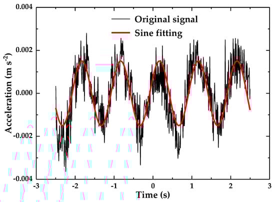 The acceleration detection resolution and range experiments used a sine waveform with a constant frequency of 1 Hz as the excitation signal, and the amplitude of the excitation was adjusted from small to large until the accelerometer produced a clearly sinusoidal waveform. Then, the output voltage of the optical accelerometer was converted into the corresponding acceleration by dividing by the sensitivity. The experimental results are shown in Figure 11. It can be seen that the resolution of the accelerometer is 0.003 m·s−2 approximately. The maximum acceleration that the accelerometer can measure amax can be calculated by: