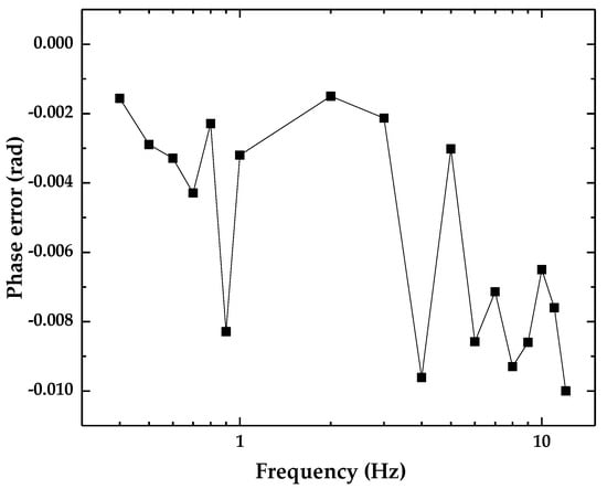 Experiments were also conducted to investigate the phase-frequency performance of the accelerometer with frequencies in the range of 0.4–1 Hz with an interval of 0.1 Hz, and in the range of 1–12 Hz with an interval of 1 Hz. The LDS was configured to output analog signal of 4–20 mA, which was converted to voltage signal and collected together with the output signal of the accelerometer are collected into a computer for further processing. Origin 2017 software (OriginLab Co., Ltd., Northampton, MA, USA) was used to fit the two signals, and then the phase difference between the two fitted waveforms was calculated, which is shown in Figure 12. The experimental results show that the accelerometer has a nonlinear phase error of less than 0.011 rad, which can cause the corresponding relative error of acceleration measurement of about 0.006% (calculated by: 1−cos 0.011). This is relatively quite small and can be neglected.