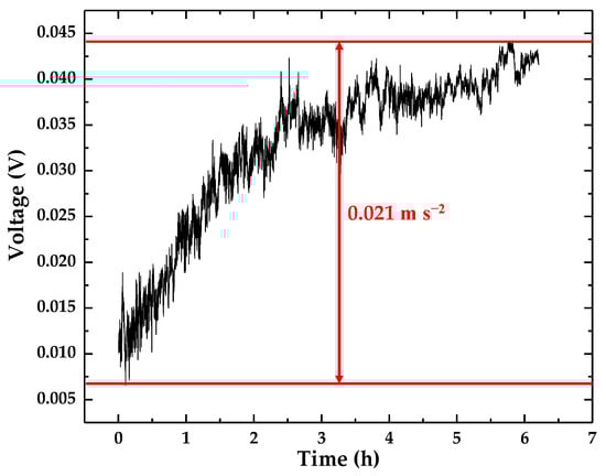 During the operation of the accelerometer, its accuracy is usually affected by a Gaussian laser beam, angular drift and other influencing factors. To determine the effect of these factors on the accelerometer, the accelerometer’s drift was tested for more than 6 h in a resting state. The experimental results are shown in Figure 14. From Figure 14, we can see that the 6-h drift of the accelerometer is about 37 mV, whose equivalent acceleration is 0.021 m·s−2.