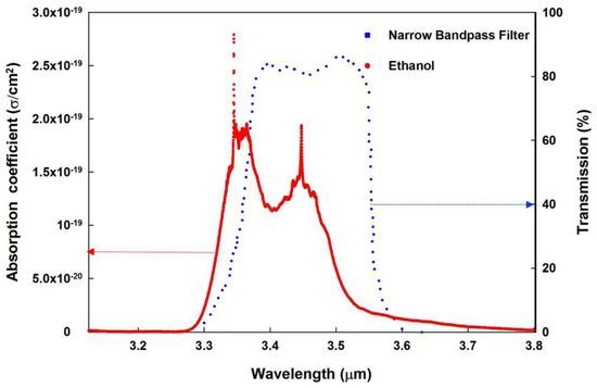 The basic structure of an NDIR gas sensor system has been illustrated in the articles [19,26] and it comprises the following components: a broadband IR source along with its driving circuit, an optical waveguide, and an IR detector with a narrow band-pass filter attached to it. The operation of an NDIR gas sensor lies in the principle that when broadband radiation is emitted by an IR source, the narrow band-pass optical filter turns the IR detector into a much specific narrow band detector that screens out all the radiation except for a particular wavelength, which is absorbed by the sample gas. Typical absorption spectrum of ethanol is at 3.45 μm [27]. The IR absorption spectrum of ethanol and transmission spectrum of narrow band-pass filter which is used in this research, are plotted simultaneously in Figure 1. The overlapping of the two spectra significantly improves the detection of target gas at the mentioned peak wavelength.