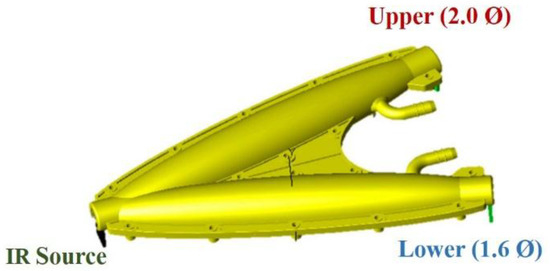 The characteristic absorption of a gas occurs in the analysis cell structure. Although larger optical path length is desired, the dimension of the chamber must be within acceptable range [34]. Several waveguide structure of various shapes and sizes have been studied over the years—cylindrical with circular cross section [26], spherical [9], combination of pairs of off-axis parabolic mirrors and right-angle mirrors [35] etc. Elliptical structures, in particular, can be characterized by the property that light traveling from one focus reaches the other focus. This shape was utilized for offering extended optical path length and multiple reflections of light from IR source to the detector end. A larger aperture combined within a smaller structure provides compactness [15,36]. Using dual wavelength differential principle, both symmetrical [12,37] and asymmetrical [38] single ellipsoid was optimized to achieve high sensitivity of the methane detector. Two intersecting symmetrical ellipsoid structure, similar to the proposed one in this paper were reported in [11,16]; source and detector are placed in focus of separate ellipse in [11] whereas the source is placed in a common focus and each detector at the remaining two focuses in [16].