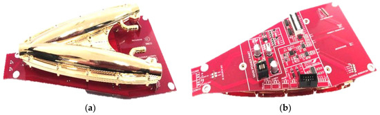 (a) Fabricated dual elliptical ethanol sensor module; (b) Printed circuit board below the dual elliptical structure.