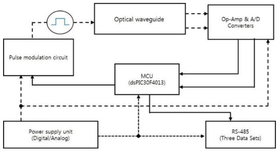 For signal conditioning, the two electrical power supply-analog and digital are kept apart to acquire the stability. This is because the IR source is modulated at a high input power of 600 mW. A variable resistor is used to adjust the peak analog supply voltage of 9 V applied to the IR source. The on- and off-time pulses are controlled by the MicroController Unit (MCU). The integrated IR detectors with ASIC chip were installed. A pre-amplifier is housed in the same packaging. The detector signals are enlarged by a pre-amplifier (MAX4239, Maxim Integrated Products Inc., San Jose, CA, USA) which offers low drift and ultra-low offset. The analog signals are converted into digital ones by an A/D converter after the signals have passed through two stages of differential OP-AMP. This amplifier helps to measure the difference between the output voltages more precisely and improving the sensitivity. Output signals are transmitted through the RS-485 (Analog Devices, Inc., Norwood, MA, United States) chip to the computer for further analysis. The block diagram of the circuitry is presented in Figure 4. The analog signals are represented as dotted lines whereas solid lines imply digital signals.