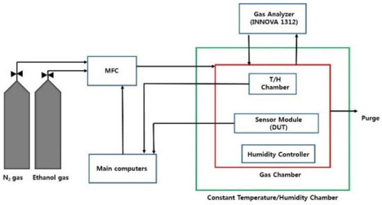 To evaluate the output characteristics of the sensor module according to the temperature and the ethanol gas concentration, a measurement system as shown in Figure 6 was set up. First, the sensor module was inserted into a closed gas chamber inside the thermo-hygrostat, and the temperature was adjusted from 253 K to 333 K at step intervals of 10 K except at the temperature at 298 K. After adjusting the temperature, more than 4 h had passed before the thermal equilibrium state of the sensor module was attained. When the variation of the output of the temperature sensor was within ±5 mV of the previous experimental result, the mass flow controller (MFC) of gas was turned on. Subsequently, the gas inside the chamber was purged with high-purity nitrogen (99.9999%, class 6) to reach 0 ppm by waiting for 1 h or more. The experiments were then carried out by feeding a high concentration of ethanol gas through the mass flow controller of gas into the sealed gas chamber, from 0 to 500 ppm in 50 ppm step units.