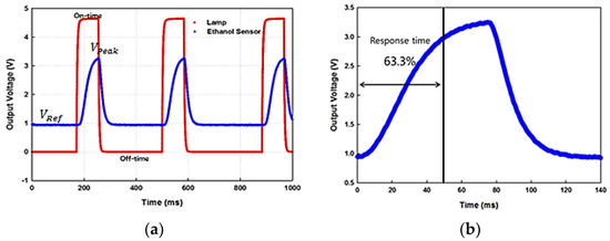 The IR source is modulated for pulse generation and recorded on-off time is shown in Figure 7a. The optimum on-off time of IR source is found to be 100 ms and 300 ms, respectively. The values were chosen after iterative experiments. It takes a while for the source to transmit IR energy to the detector, so that the sensor response can reach to the peak amplitude level but even if the on-time is further extended, the peak voltage does not increase significantly. On the other hand, if the off time is shorter, peak value of voltage cannot be reached. In case of longer off time, the data sampling duration will be higher. The response time of the ethanol sensor is observed to be 48 ms as seen in Figure 7b.