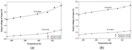 Output voltages at 0 ppm ethanol concentration with varying temperature obtained from (a) normal sensor module; (b) sensor module with Parylene-C deposition.