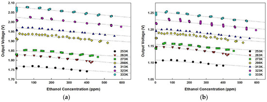 Here, ln(a) can be expanded in the form of a standard series and ethanol concentration can be estimated by substituting the series in Equation (4) [16]. Precise measurement and the trend of response of initial output voltage at 0 ppm concentration, and the output voltage curves after injection of ethanol at different ppm levels over a varying temperature range will determine the accuracy of measurement.