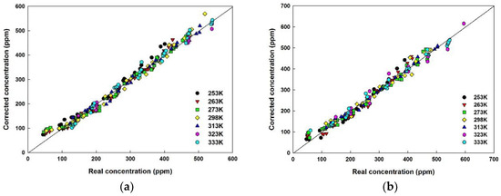 Differences between initial calculations and regression analysis yielded higher error below 50 ppm concentration. However, in the case of more than 50 ppm, the average error range is around ±5%. Although the error percentage is quite similar between the sensor with deposition and without deposition, since the sensor module deposited with Parylene-C has a larger output voltage change depending on the gas concentration than the normal sensor module, a more accurate estimated concentration can be obtained. The average error between each combination of the detector at 298 K for Parylene-C deposited module are plotted in Figure 11.