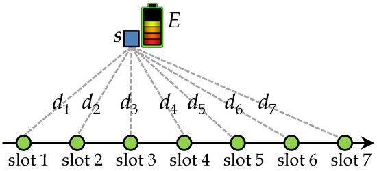 In the SEN-TS-1 problem, let be the distance between the only sensor s and flight position m. Let E be the available energy for sensor s and be the set of available slots to sensor s. Figure 2 illustrates the SEN-TS-1 problem, and it can be formulated as the following optimization problem: