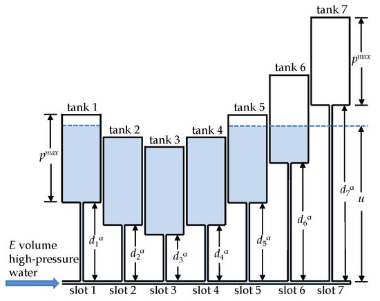 Let us investigate a situation where the system of tanks is filled with a total of E volumes of water. Let u be the water level as shown in Figure 3 and let be the amount of water in tank j that equals the height of water from the bottom of tank j. Then we have if ; if ; if . This matches Equation (31) exactly. Moreover, because the water’s total volume is E, we have . Thus, p is the solution to the SEN-TS-1 problem. ☐