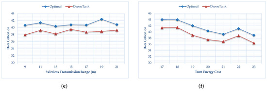Figure 4 shows the performance comparisons of our proposed algorithm (named DroneTank) to the brute force search algorithm, measured by the total amount of data collected by the mobile sink in one trip. Figure 4a–f show, respectively, how the six parameters affect performance, namely, the number of sensors, the average sensor energy budget for transmission, the UAV energy budget for flight, UAV speed, wireless transmission range, and turn energy cost. Figure 4a shows the results of the simulations, in which we change the number of sensors deployed from 11 to 29 with step 3. We observe that the data collection produced by our algorithm is near the optimal maximum data-collection produced by brute force search. Our proposed algorithm constantly achieves 95 percent of the optimal value, and the performance is quite stable regardless of network size. Figure 4b shows the simulation result when we change the average sensor energy budget for data transmission from 100 to 400 mJ with steps of 50 mJ. Under different average sensor energy budgets, our proposed algorithm performance remains stable, it achieves 95 percent of the optimal data transmission. Moreover, the larger the average sensor energy budget, the larger the data collection by the drone. From Figure 4c, we observe that when we change the UAV energy budget from 260 to 380 with a step of 20 units, our algorithm’s performance drops from around 97 to around 92 percent. This is because the more budget UAV has for flight planning, the more distance the UAV is allowed to cover, and the more turns it is allowed to make. Our proposed algorithm may miss the optimal solution among so many choices. However, the computation time of the brute force search algorithm increases exponentially with the increasing of the UAV energy budget. Figure 4d indicates the data collection is affected by the UAV speed: the higher speed, the less data collected. More specifically, when the UAV speed increases from 7 m/s to 19 m/s with step 2 m/s, the data collection drops for both Optimal and DroneTank. In Figure 4e, we can see the wireless transmission rate does not have much impact on the algorithm performance, partially because the dynamical programming schedules sensor transmission when UAV is close. From Figure 4f, it can be see, if the energy consumption for each turn increases, then less data can be collected by the UAV. This is because, more energy is used in making turns, less energy can be used in covering distance which support energy efficient data collection. Compared to Figure 4a,b,e,f, we can see that the UAV energy budget and the UAV speed have a greater impact on algorithm performance than network size, the average sensor energy budget, transmission range and turn energy cost.