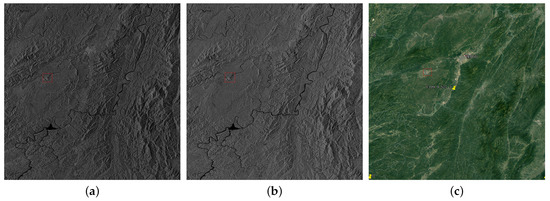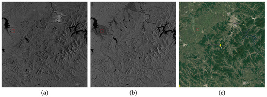 Scene 2 was imaged in scan SAR (SS) mode on July 13 in dual polarization with 25 m resolution covering 83,359.2 square kilometers. This scene is about the flood in Jilin province. The image center is located in (E126.3, N43.5). The two images of HH and HV are shown in Figure 2a,b. We also present the optical image obtained from Google Earth as a reference in Figure 2c. The land cover classifications are the same as Scene 1. We can see evident difference between HH and HV polarization in Figure 2a,b. We select one of the most obvious areas to show in Figure 2d–f. Main building areas are marked with red frames and the rest is cropland. The building areas in HH polarization image are almost the same as croplands while they have obvious different intensities in HV polarization image.