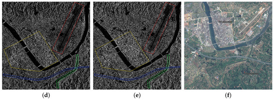 (a) HH; and (b) HV are dual polarization GF-3 images of Hunan province (3 July 2017) imaged in FSII mode with 10 m resolution covering 10,894.8 square kilometers. Image size is 10,996 × 9908 pixels. (c) The optical image of the same area obtained from Google Earth. (d–f) Selected areas of (a–c). City, airport, highway, and part of water are marked by yellow, red, blue and green frames, respectively.